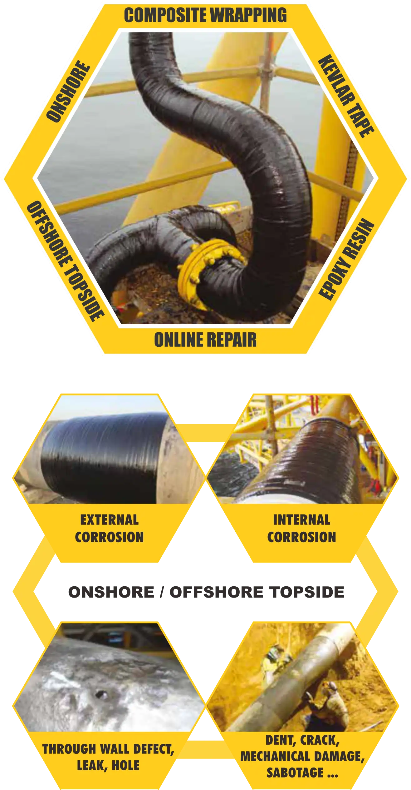 Composite repair R4D menggunakan material Kevlar® untuk memperkuat pipeline yang mengalami korosi, dent, gouge, crack, dan wall thinning. Dirancang sesuai standar ISO 24817 & ASME PCC-2.